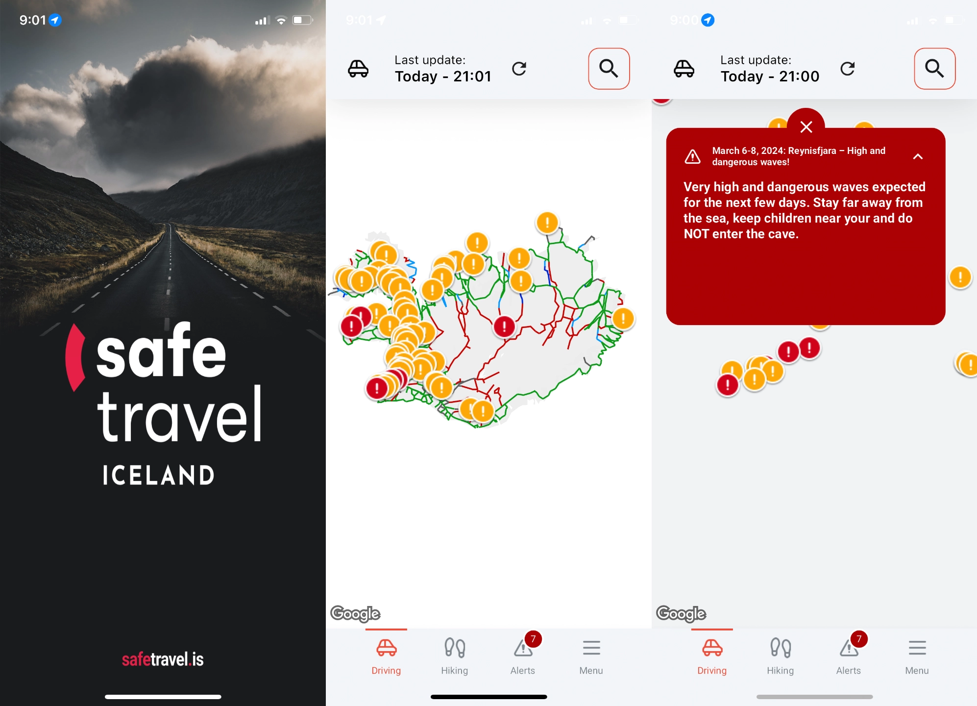 追極光之前,先確定上路駕駛的安全。因為冰島天氣變化又大又快,獲取即時路況是在冰島自駕非常重要的一環。最推薦的工具除了有冰島交通部網站 The Traffic 之外,手機下載 Safe Travel 的應用程式也可以更方便隨時查詢。