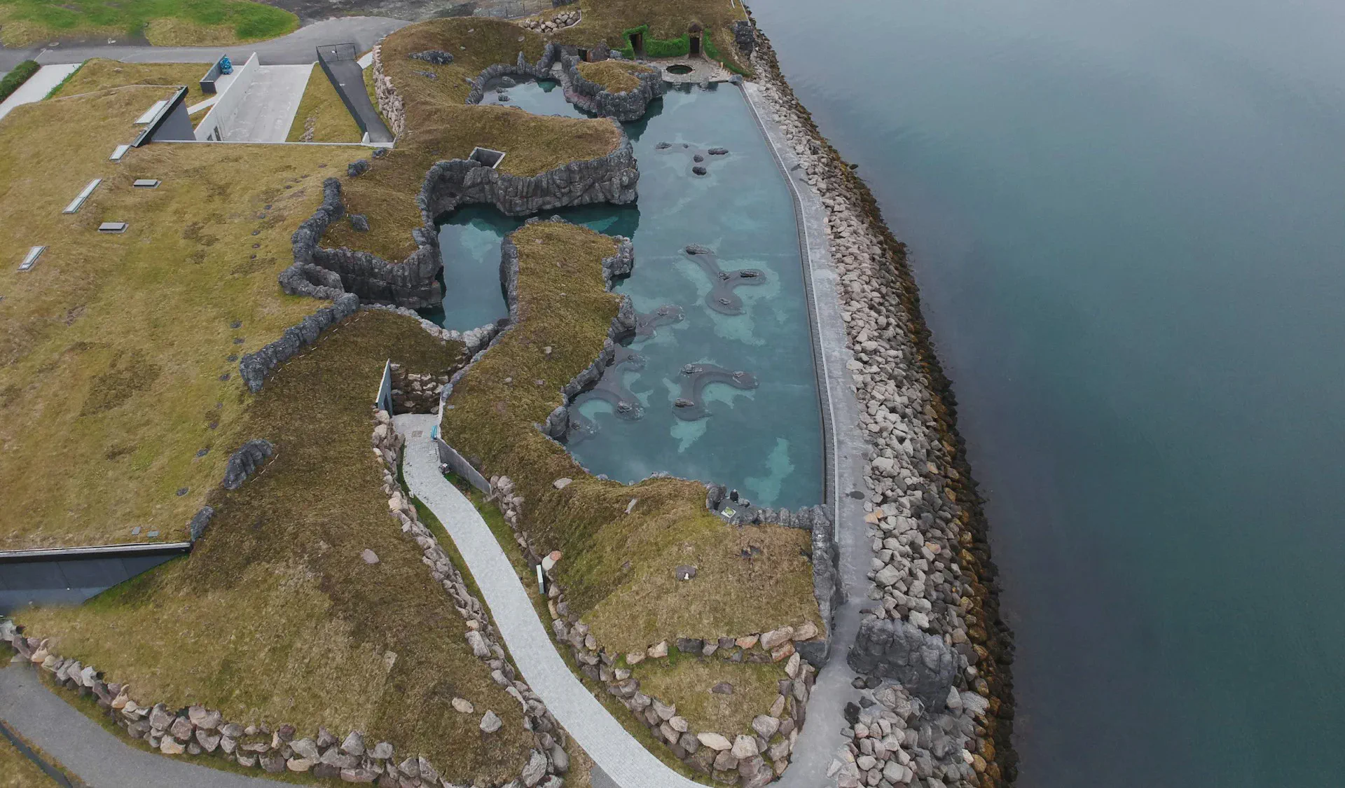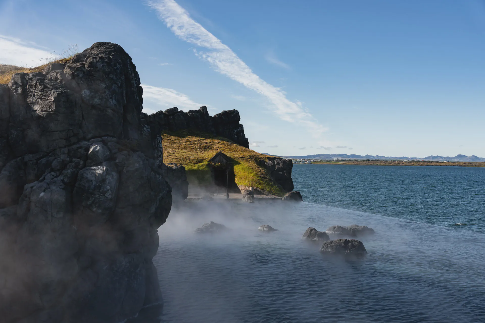 天空溫泉最讓人一眼難忘的,就是那座長達 75 公尺的無邊際溫泉池。站在池邊,眼前就是開闊無邊的北大西洋,水天一線,彷彿整片海洋都屬於你。溫泉水溫維持在 38~40°C,不管冬天雪花紛飛還是夏日午夜陽光,泡在裡頭都是滿滿的幸福。
